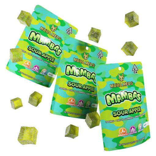 - Muha Med gummies Sour Apple | SATIVA; As the name implies, this Sativa will leave your lips puckered as you appreciate its massive taste. This Sour Apple Mambas edibles, made with all-natural fruit tastes, provides a rush of freshness followed by relief with every mouthful. This Mambas edibles is excellent for everyone because it’s not too sweet and not too sour.