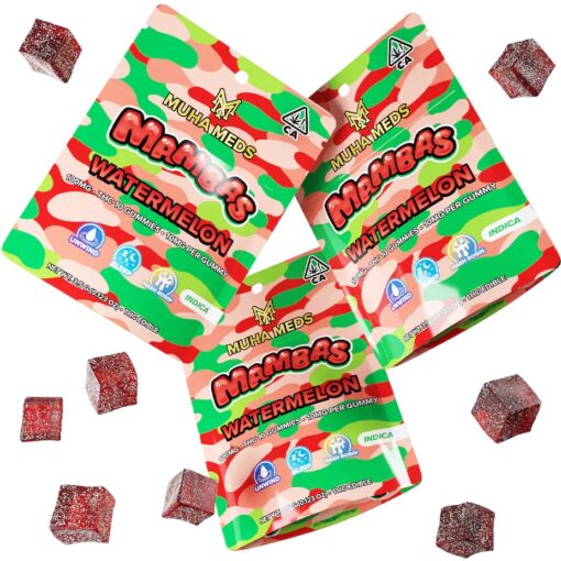- Muha Med gummies Watermelon | INDICA; Our Watermelon Muha Meds edibles are made with real fruit and natural flavors and fruits. Because it is tart, sweet, and sour, this Watermelon Indica candy is great for most conditions. These Muha Meds edibles sweets are a great way to relax after a long day, whether you’re at the beach with friends or at home.